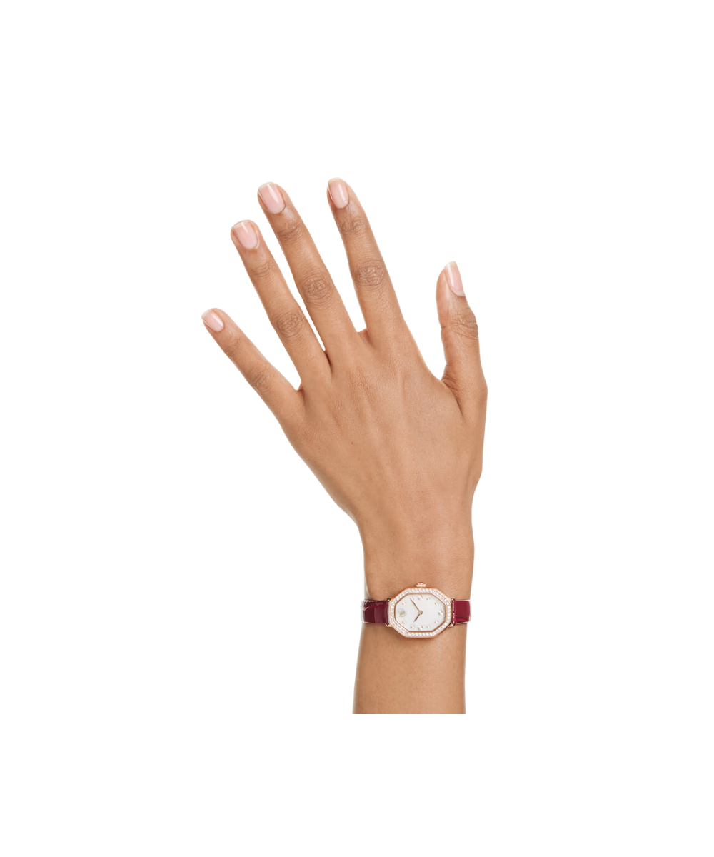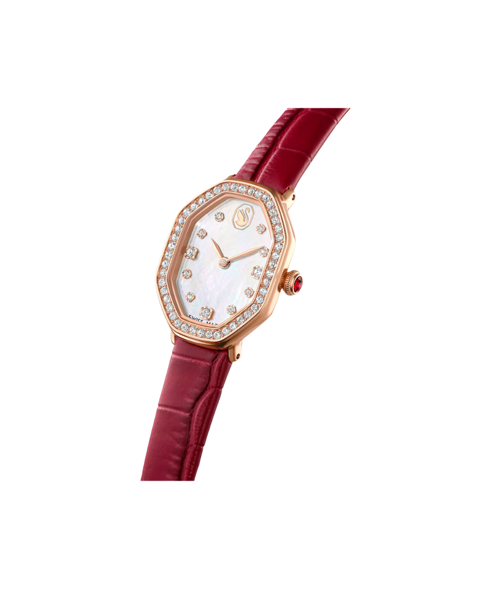 Delivering an elegant styling choice for the Lunar New Year, this 18 x 23 mm watch is uniquely crafted in Swarovski’s iconic octagon shape. Combining stainless steel and rose gold-tone finishing, the design features a pavé bezel set with 46 crystals and an additional red crystal set within the crown. The mother-of-pearl dial also includes delicate crystal indexes, along with slender hands and a swan logo at 12 o’clock. To complete this radiant creation, the watch is presented on a red leather strap with a crocodile pattern. This Swiss Made watch is water resistant to 50 m.