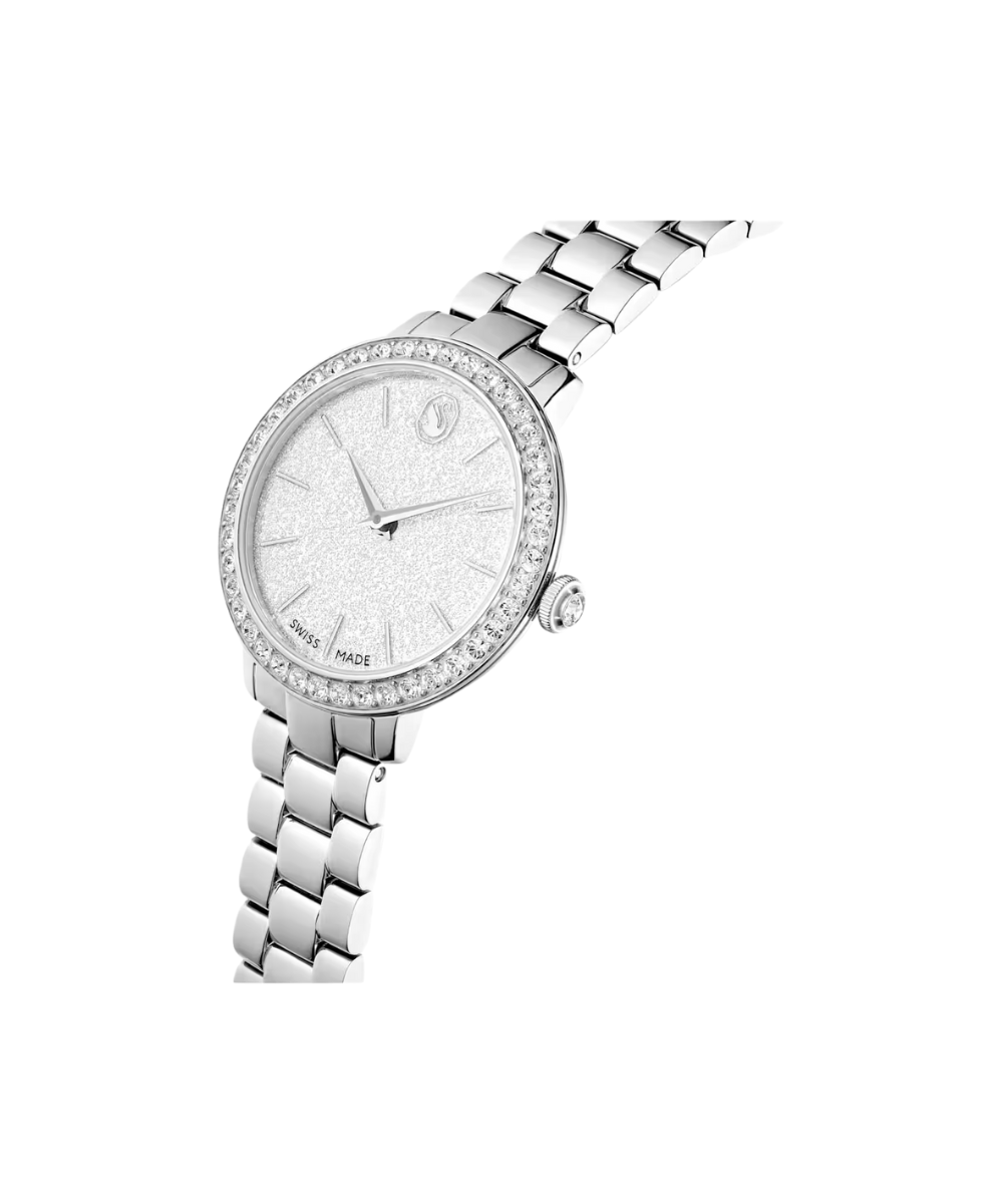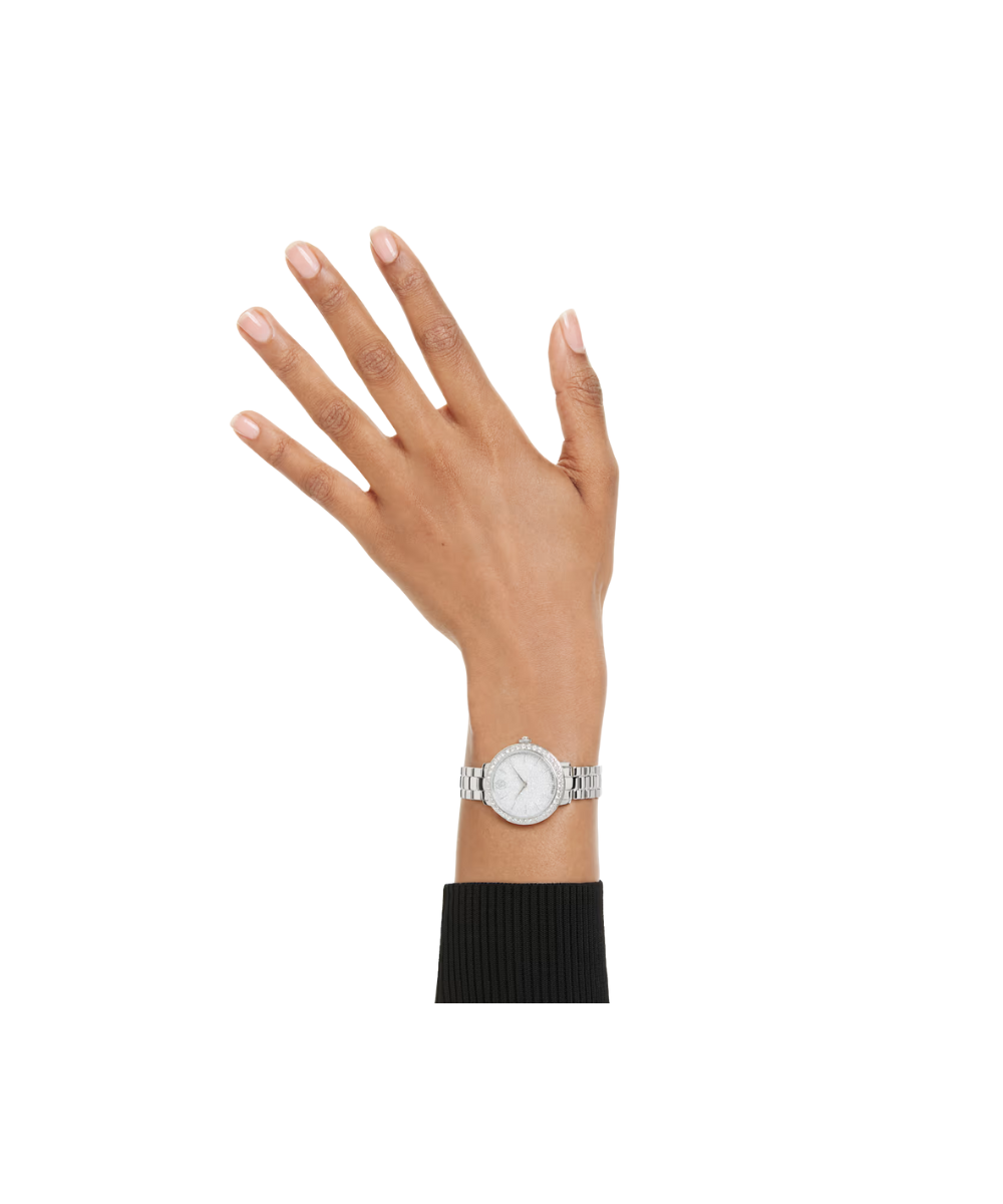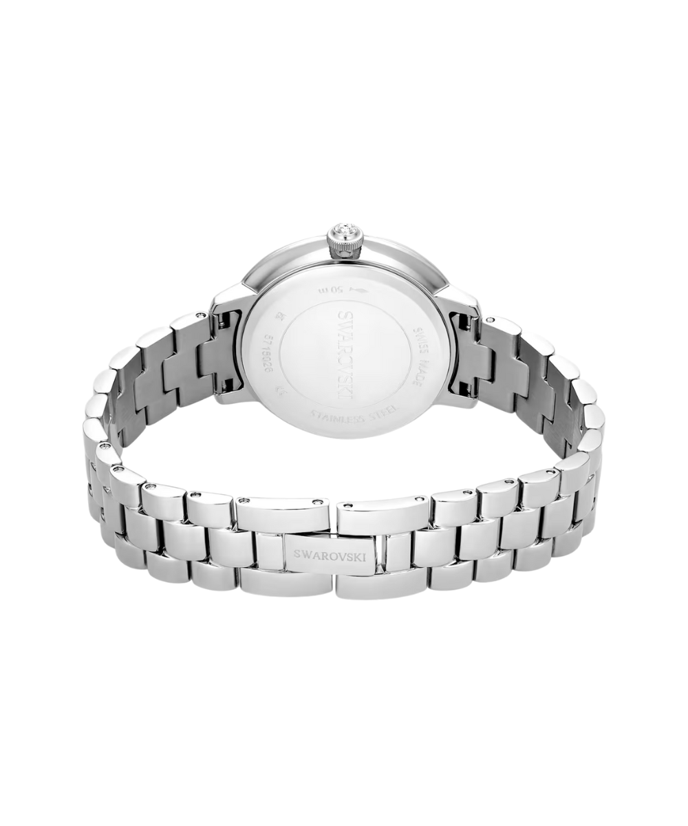 Inspired by Swarovski’s Matrix jewelry, this 30mm timepiece captures the same sense of contemporary and expressive styling. The stainless steel design features a pavé bezel set with 42 crystals, while the beautifully round dial is given a glitter effect and includes slender hour markers and hands, as well as a swan logo at 12 o’clock. Along with an additional crystal set within the crown, this watch is notable for its three-link bracelet, which glides elegantly around the wrist. The Swiss Made timepiece is water resistant to 50m and is the perfect companion for any occasion.