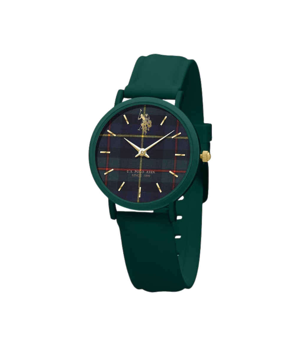 Precision Japanese quartz movement powers this refined unisex timepiece. The 36mm dark green plastic case features a sophisticated matte finish, complemented by a striking dark green and blue dial adorned with tartan graphics and golden indices. Reinforced mineral glass provides exceptional durability, while stainless steel crown and caseback ensure lasting quality. The soft-touch dark green silicone strap with stainless steel buckle delivers comfort and style. Water-resistant to 3 ATM, this watch seamlessly transitions from everyday wear to casual occasions.