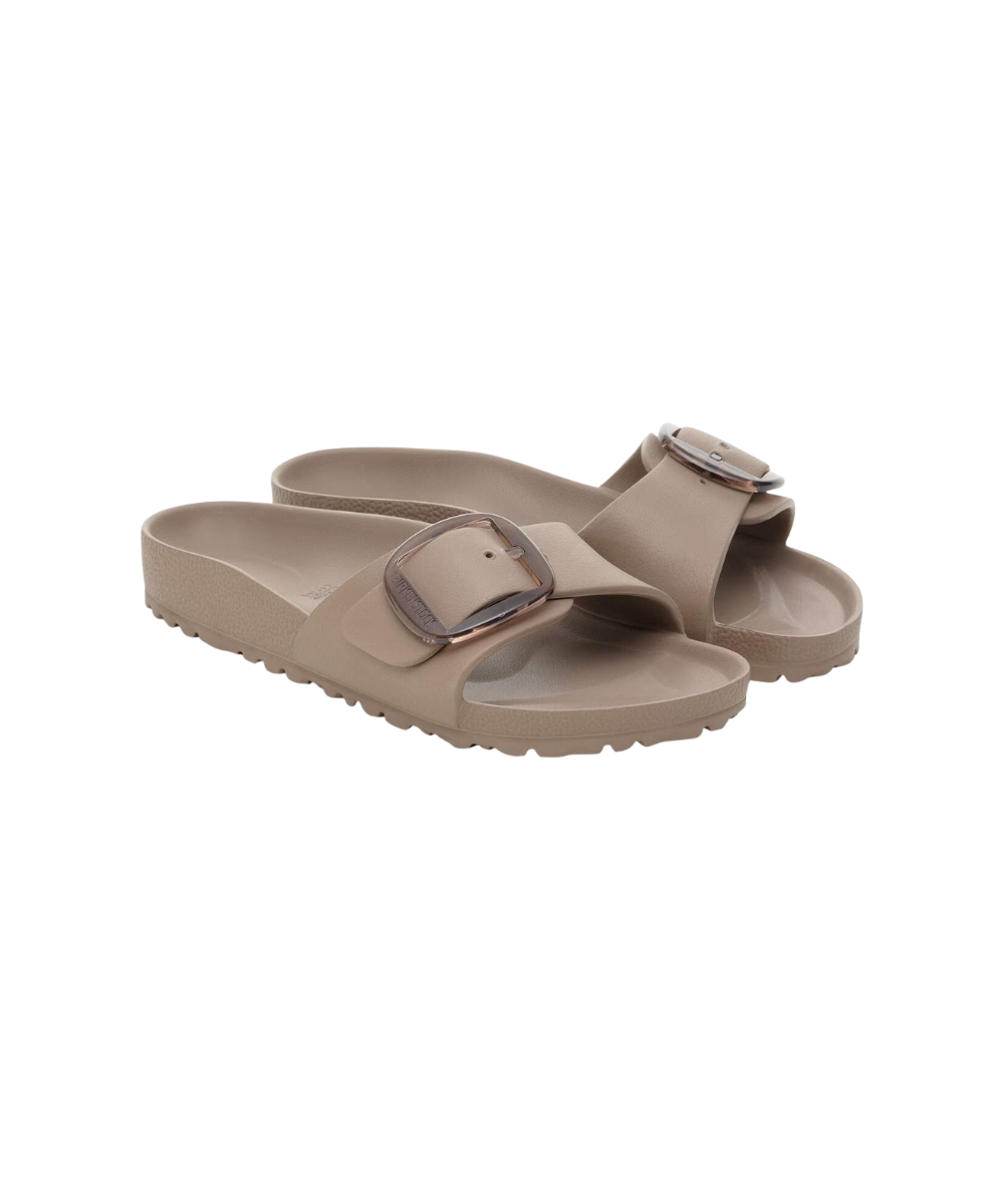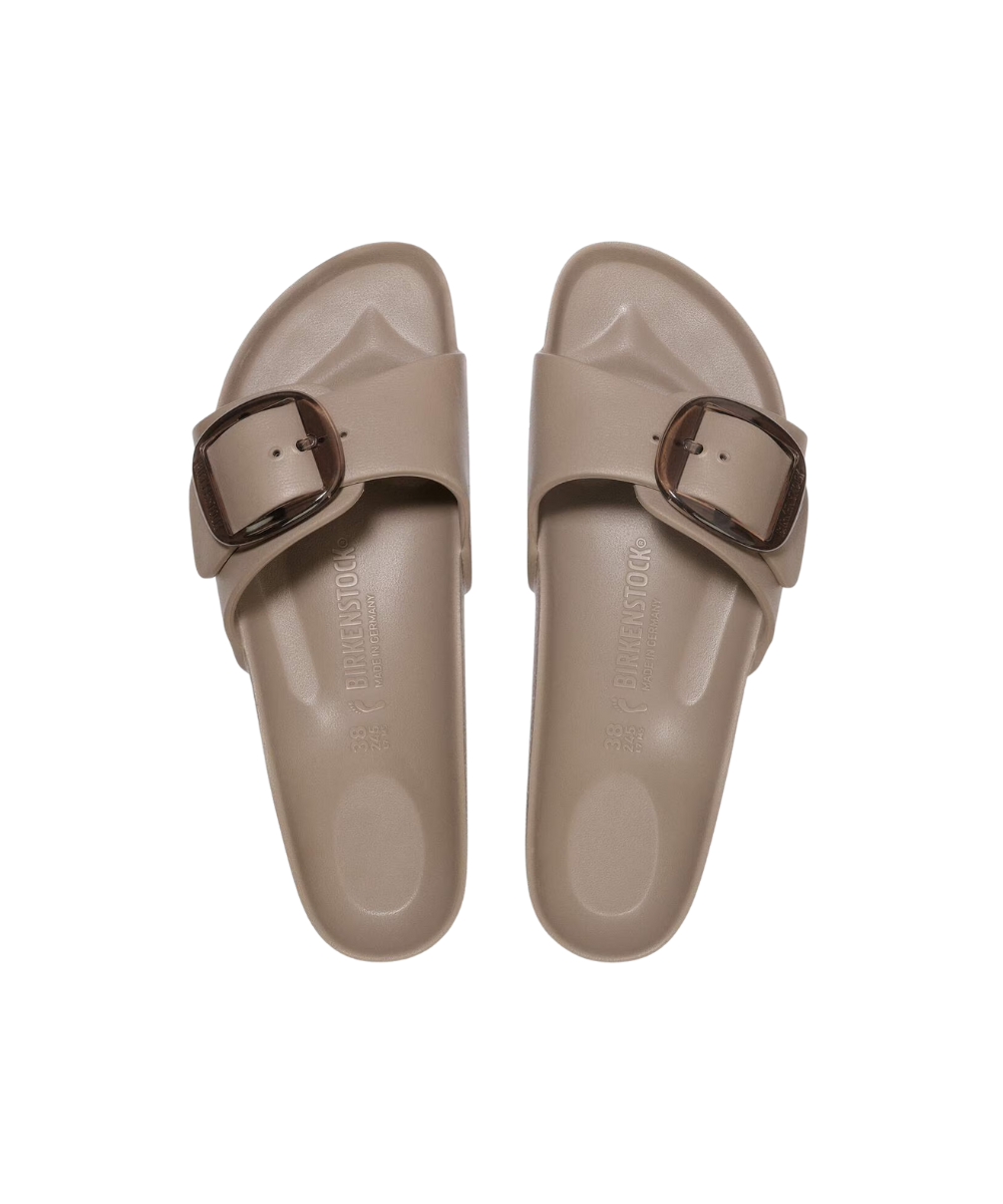 This is a new and modern interpretation of the BIRKENSTOCK classic Madrid. This version features our popular Big Buckle made from a stainless synthetic material and makes an impression with its durability and minimalist design. Modeled on the cork sandal, it is made from the ultra-lightweight and highly flexible synthetic material EVA. The high-quality, odor-neutral EVA has been tested for harmful substances and combines numerous positive attributes: it is very light, highly elastic, shock-absorbent, water-resistant, and skin-friendly.