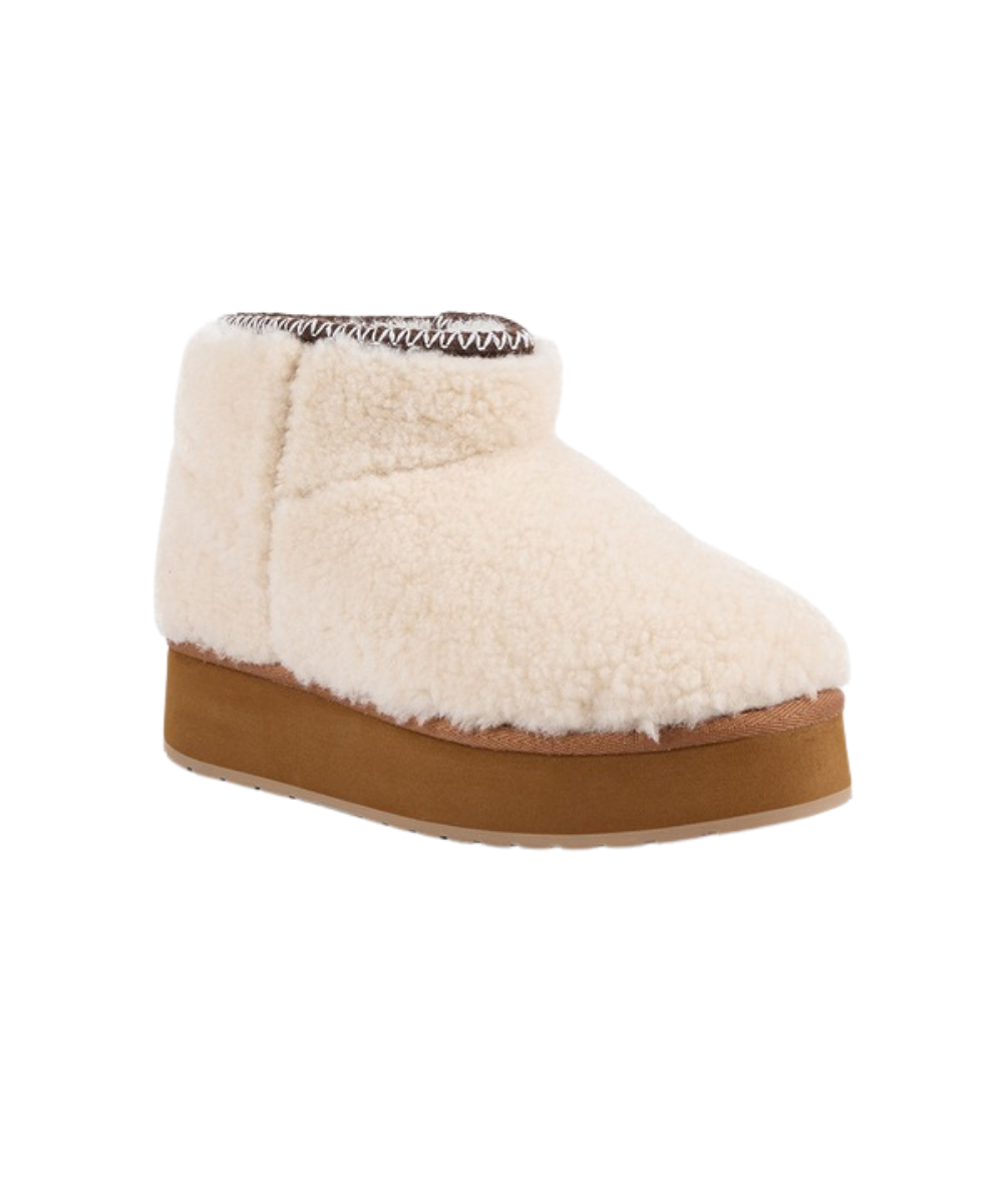 This one’s got big cosy energy with a bold little lift. With teddy sheepskin all over and a chunky platform sole, this micro boot is snug, soft, and seriously standout.