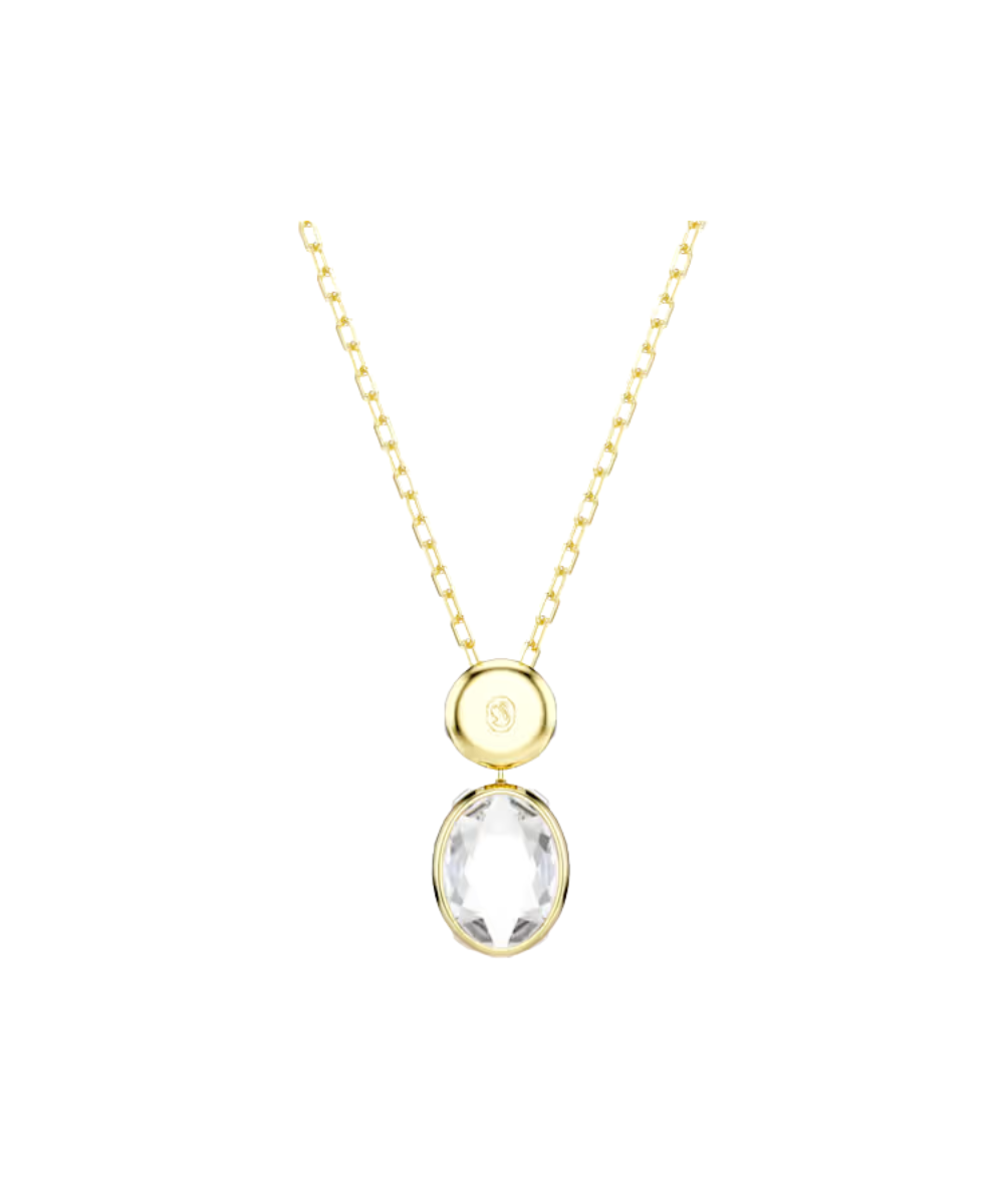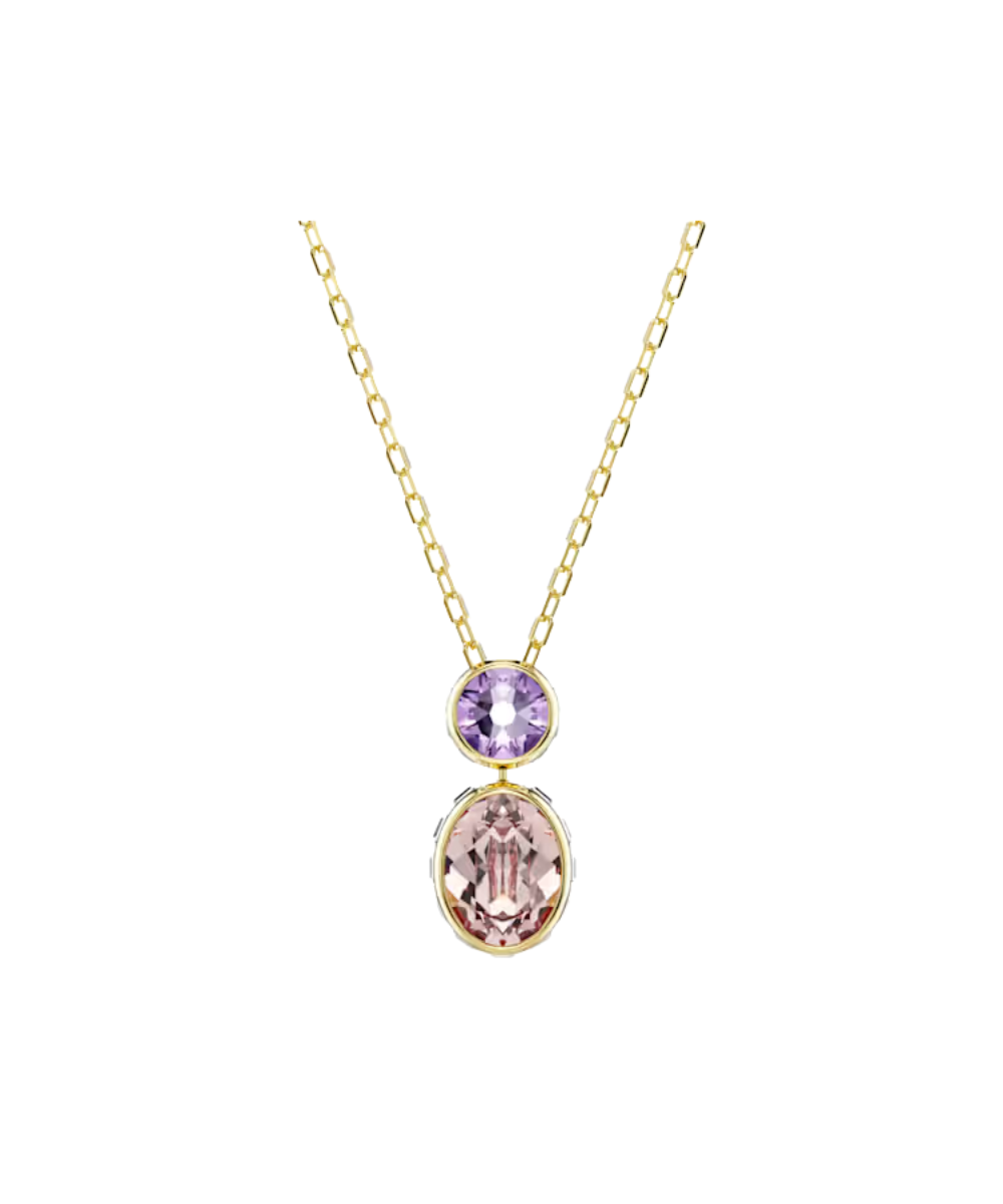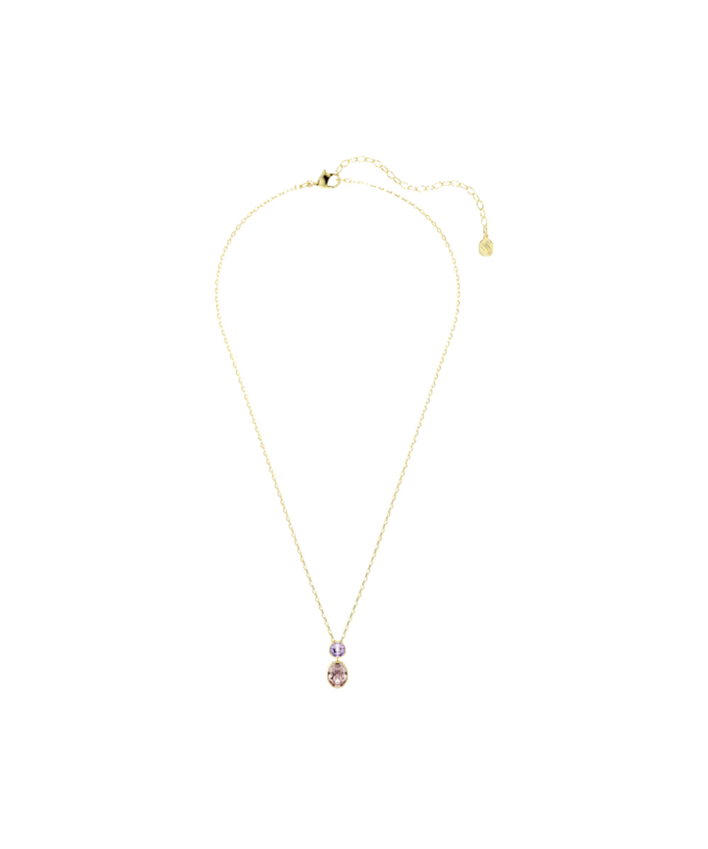 With this Chroma pendant, you can twist the crystal to suit your mood. The gold-tone design features a central purple crystal and a larger reversible crystal beneath, which is clear on one side and pink on the other. Twist it any time to play with personal expression.