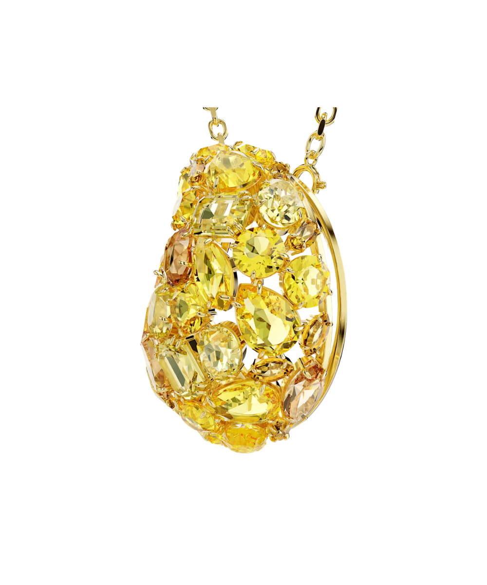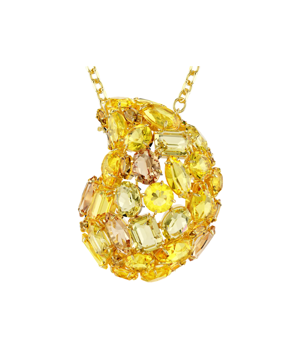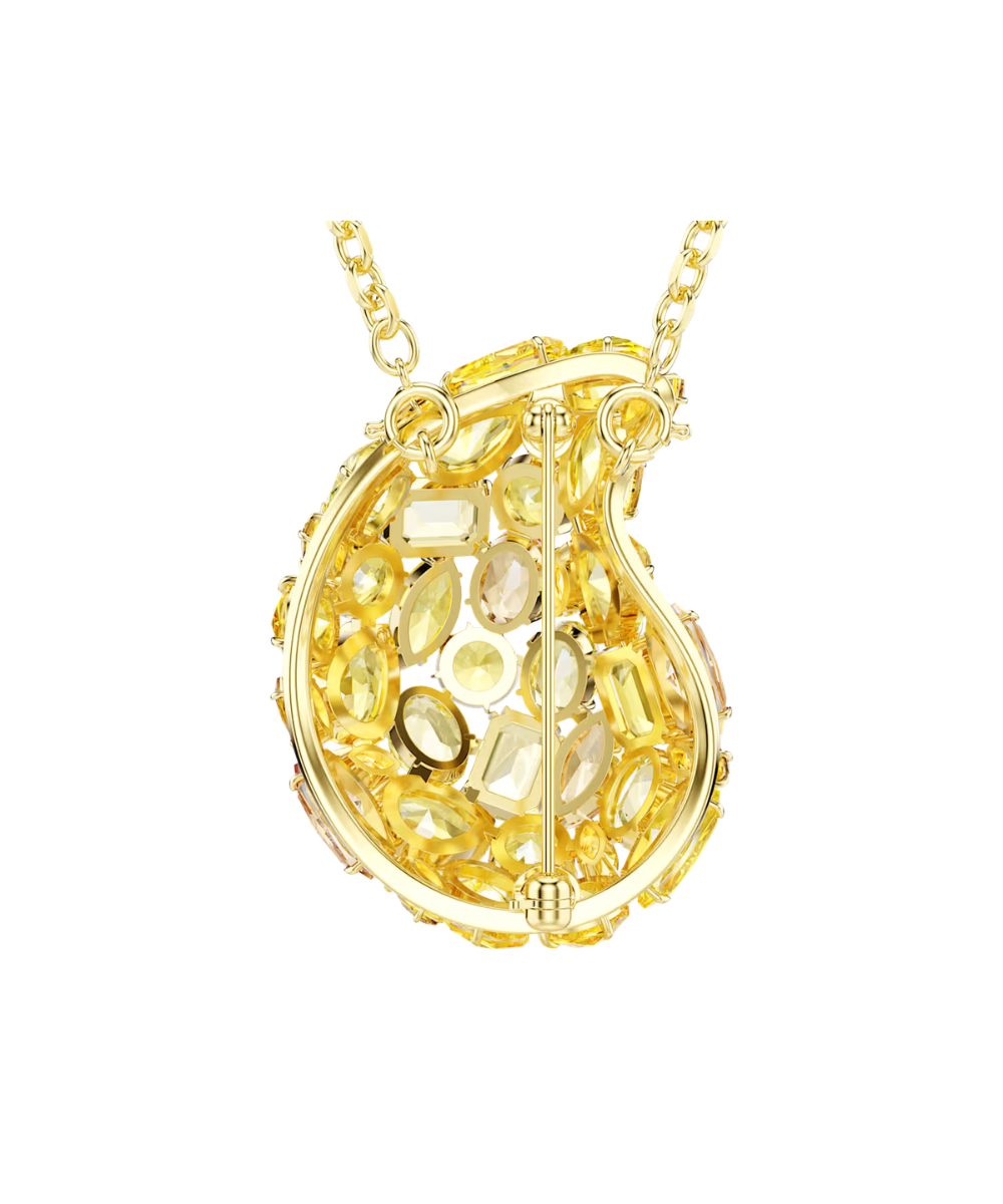 Doubling as both a pendant and brooch, this versatile creation delivers two pieces of vivid jewelry in one. The central motif is suspended from a delicate gold-tone plated chain and features a mesmerizing puzzle of crystal cuts in yellow and amber tones. It is emblematic of Gema’s unexpected formations and vibrant beauty, and glows even brighter when worn alongside matching jewelry pieces from the same family.