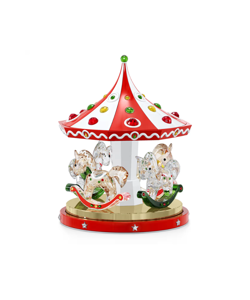 Inject holiday cheer into your décor with this rotational carousel that shines from every angle as it is manually spun. Awakening memories of festive markets filled with joyful music and twinkling lights, it is beautifully crafted with over 2,200 multi-colored crystal facets and four full-cut crystal rocking horses. The warm gold-tone metal platform and small crystals that adorn the red and white roof add extra merry flourishes. An incredible centerpiece and great for gifting. Decoration object. Not a toy. Not suitable for children under 15.