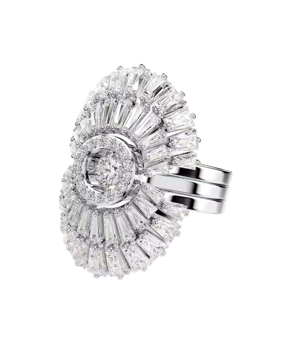 These stackable rings from the Hyperbola family are the perfect way to bring versatility into your style. Inspired by the beauty of the ocean, the rhodium-plated designs form a shell-like design, and can be worn individually or as a full set of three. The two outside rings feature a fan of clear Swarovski Zirconia, while the central ring is presented with a halo of small clear crystals and a radiant dancing crystal that catches the light. A statement set that will add instant impact to your look.