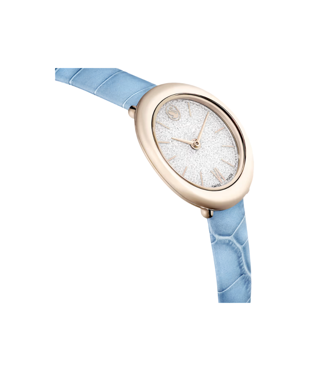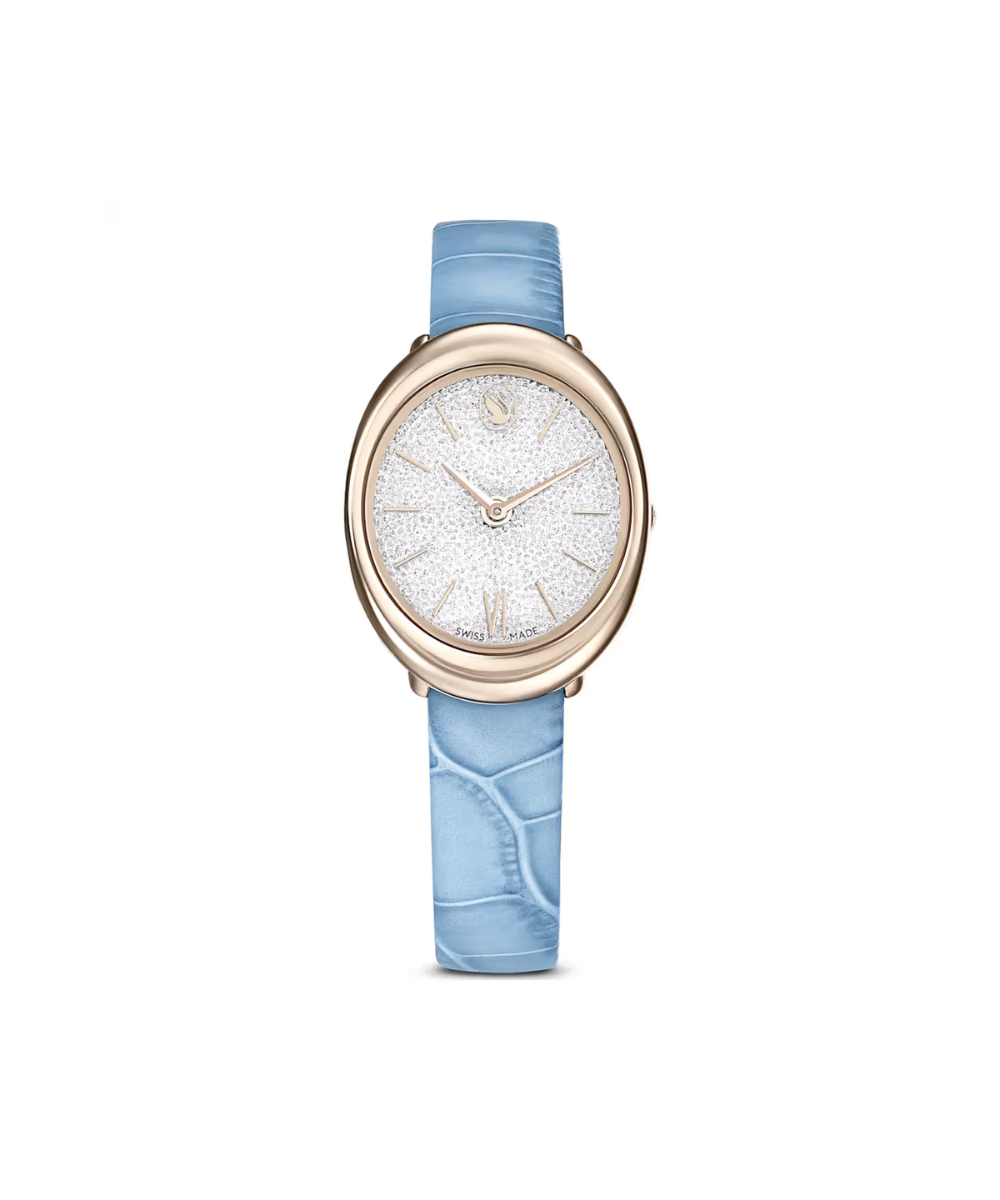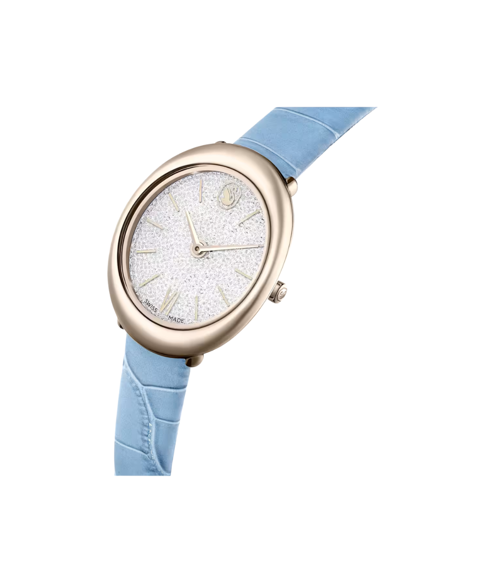 The Imber timepiece conveys a modern approach to watchmaking through its glittering dial and timeless elliptical shape. This 24 x 26.3 mm stainless steel version is champagne gold-tone finished and features around 1000 clear crystals on its Crystalline dial. Amongst the slender hour markers, a single Roman numeral is displayed at 6 o’clock, while Swarovski’s iconic swan is placed at 12 o’clock. The Swiss Made watch is worn on a blue leather strap with crocodile print and offers a water resistance of 50m. Make this your go-to choice for sophisticated day-to-night styling.