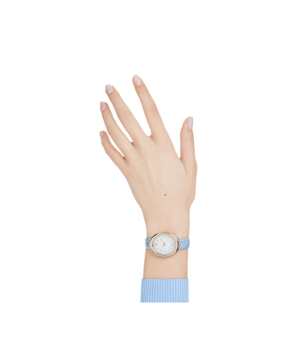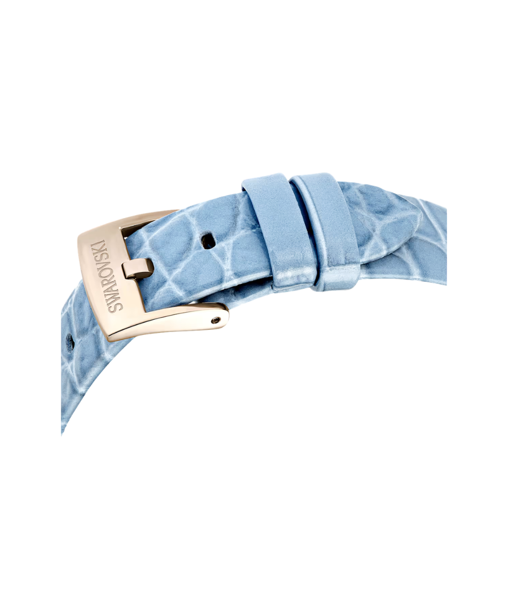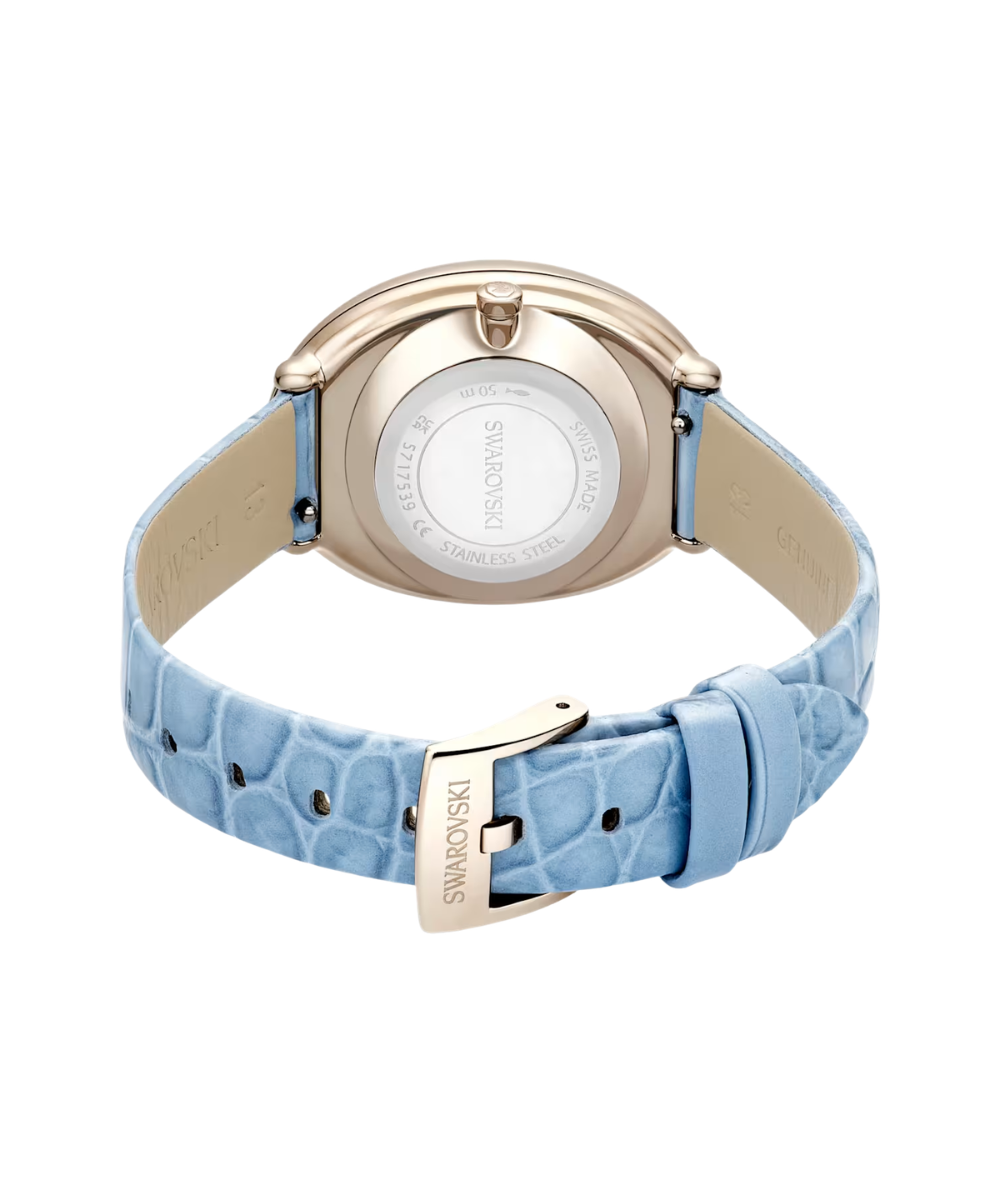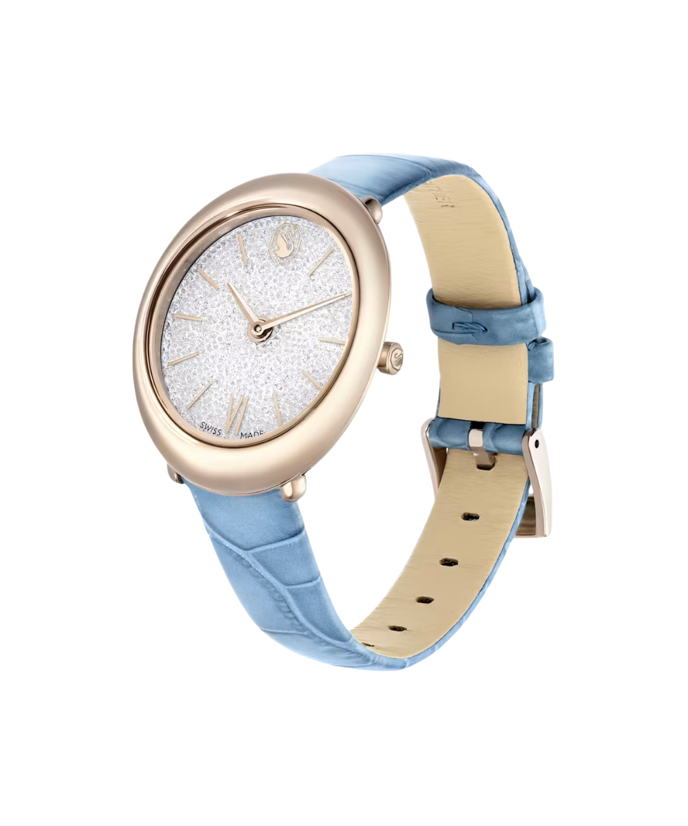 The Imber timepiece conveys a modern approach to watchmaking through its glittering dial and timeless elliptical shape. This 24 x 26.3 mm stainless steel version is champagne gold-tone finished and features around 1000 clear crystals on its Crystalline dial. Amongst the slender hour markers, a single Roman numeral is displayed at 6 o’clock, while Swarovski’s iconic swan is placed at 12 o’clock. The Swiss Made watch is worn on a blue leather strap with crocodile print and offers a water resistance of 50m. Make this your go-to choice for sophisticated day-to-night styling.