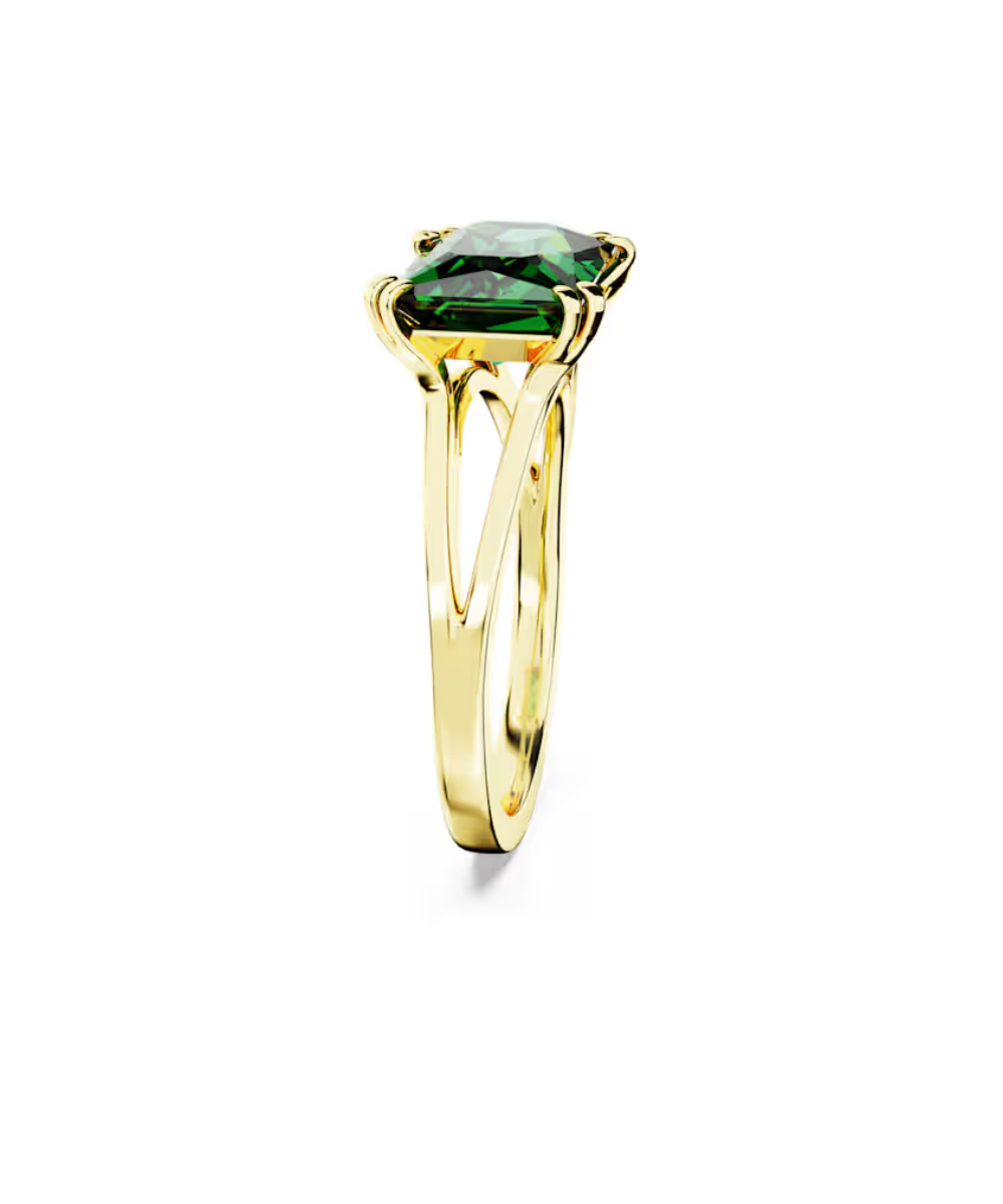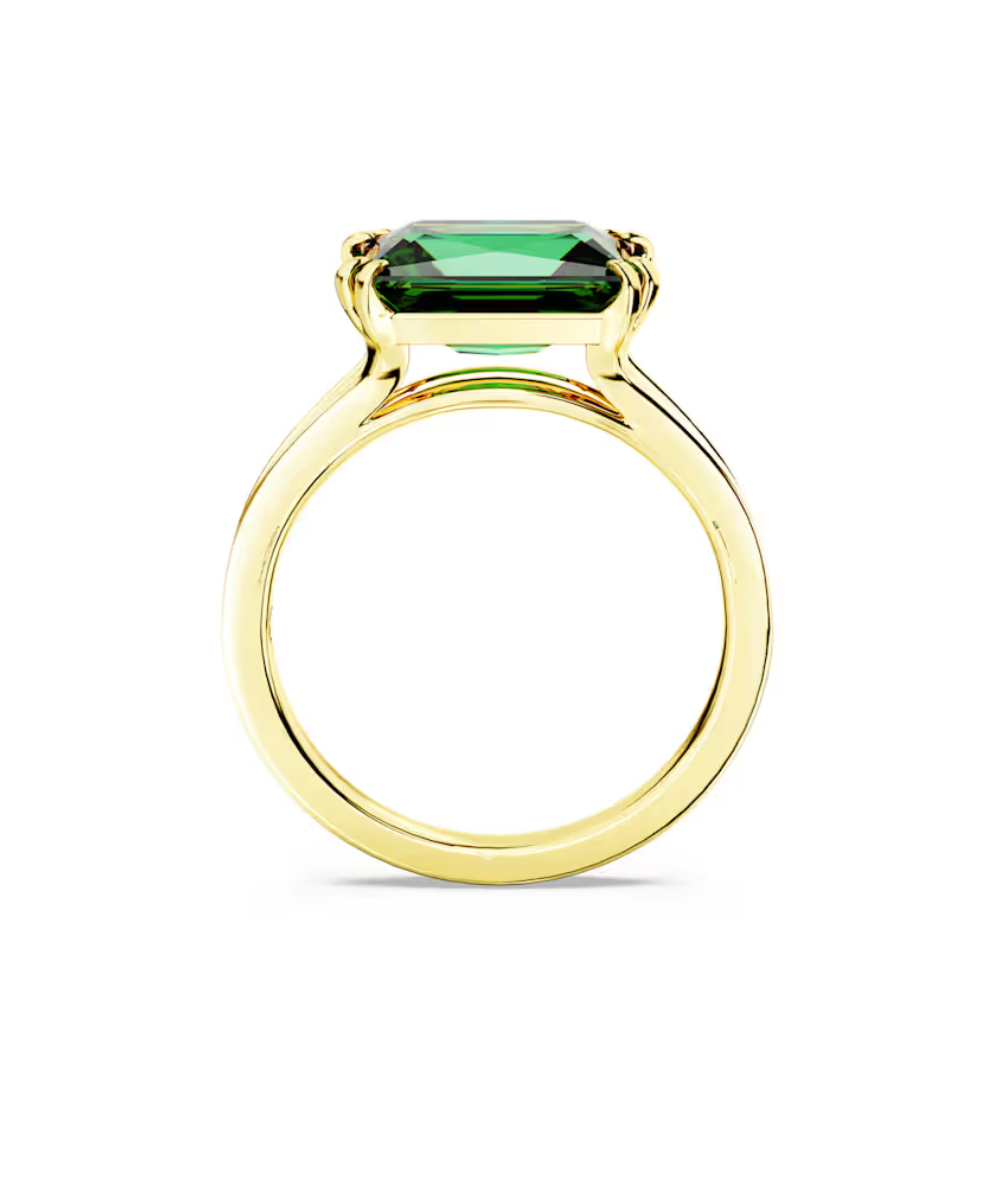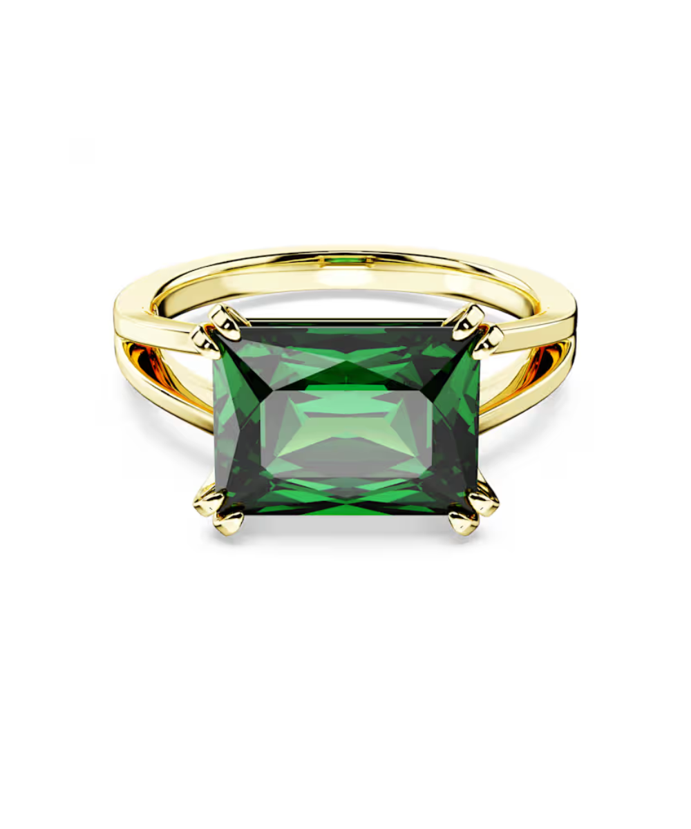 This Stilla ring has a modern twist thanks to a verdant flourish of green. Crafted with gold-tone plating, the refined band is adorned with a rectangular Swarovski Zirconia in an energizing emerald hue, held in place by an elegant double prong setting. A contemporary choice that exudes natural beauty.