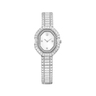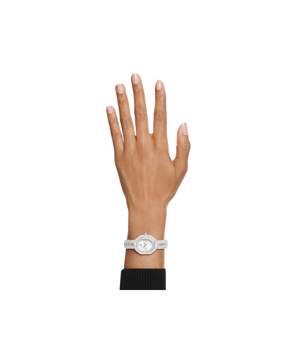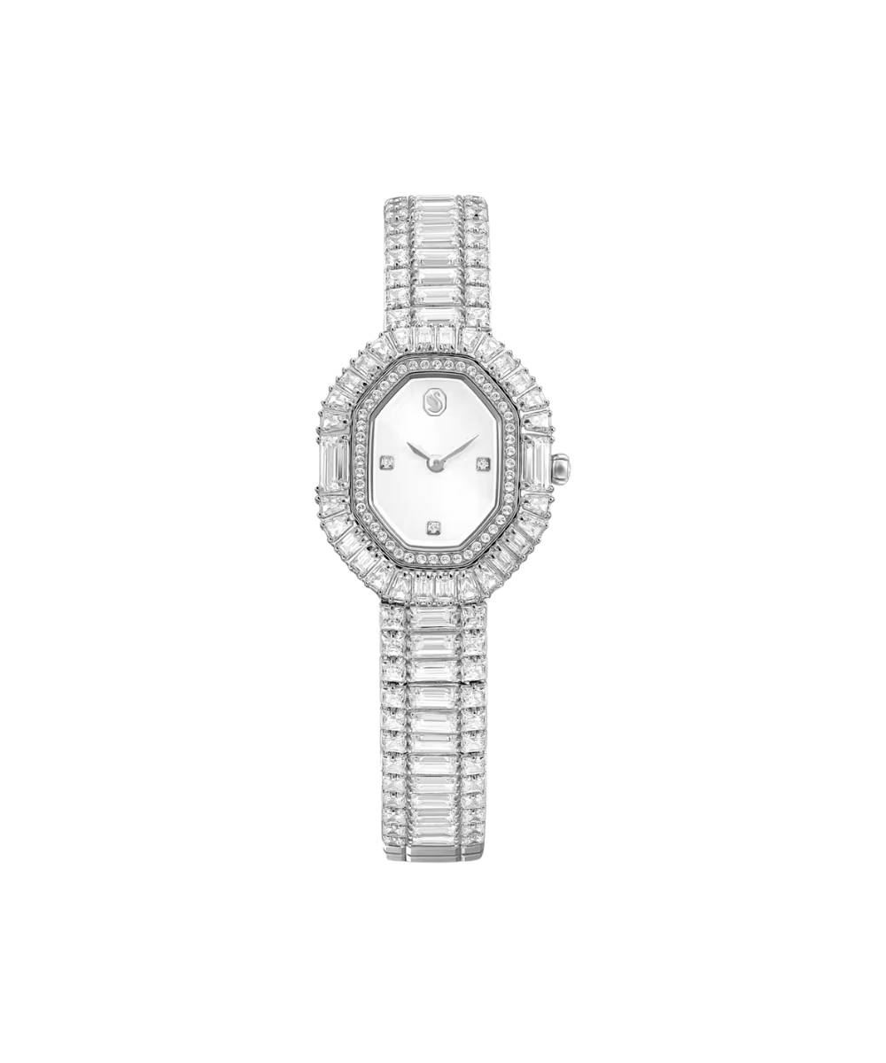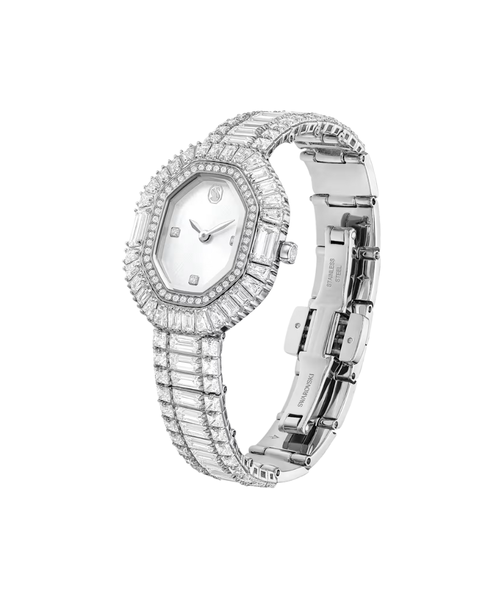 This innovative timepiece is a one-of-a-kind creation that combines signature design with mastery of light. Crafted with genuine savoir-faire, the watch is inspired by the Matrix jewelry family and features a 13 x 18 mm case in stainless steel. The bezel is presented in the House's signature octagon shape and is set with a stunning mix of 78 round and fancy cut crystals and Swarovski Zirconia. This provides a radiant frame for the minimalist sunray dial, which elegantly displays three crystal hour markers and a swan logo. A single crystal is also placed within the crown, while around the wrist, the luxury is heightened further by a radiant bracelet set with 72 Swarovski Zirconia. This watch is water-resistant to 50m and symbolizes Swarovski’s modern luxury at its very finest.