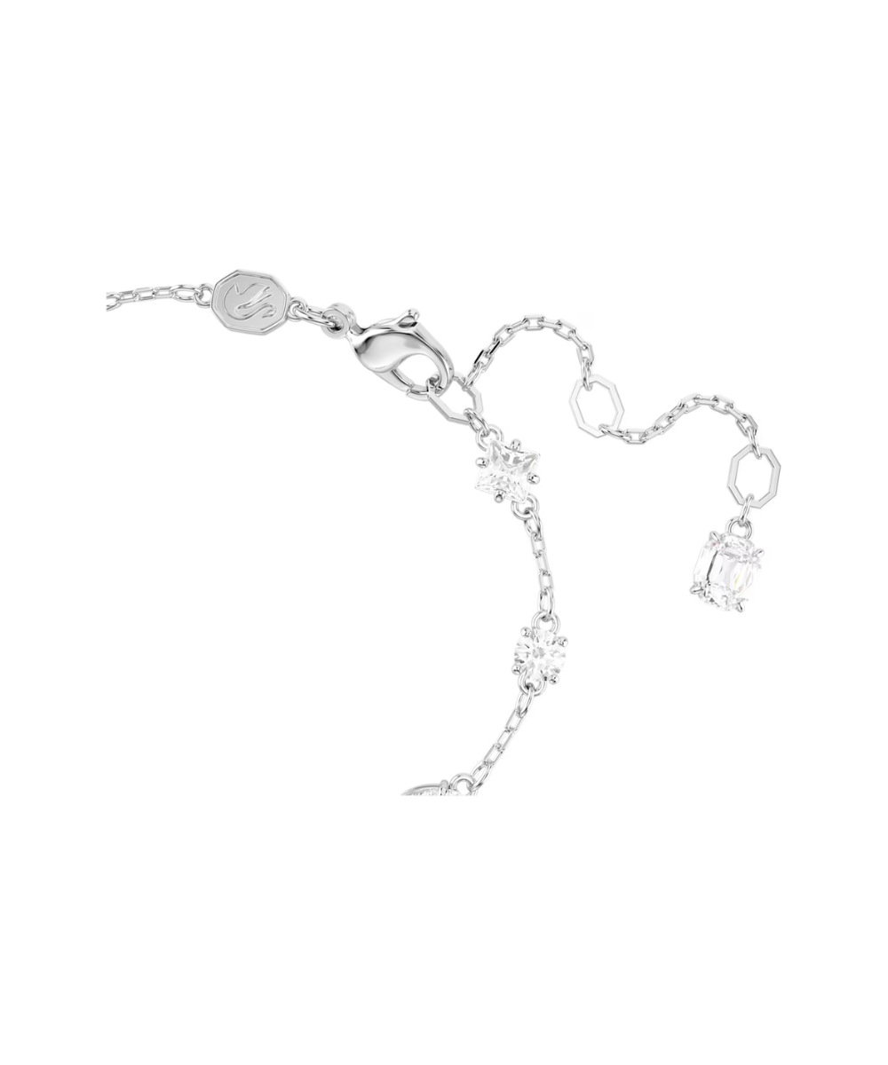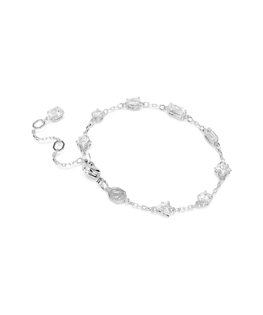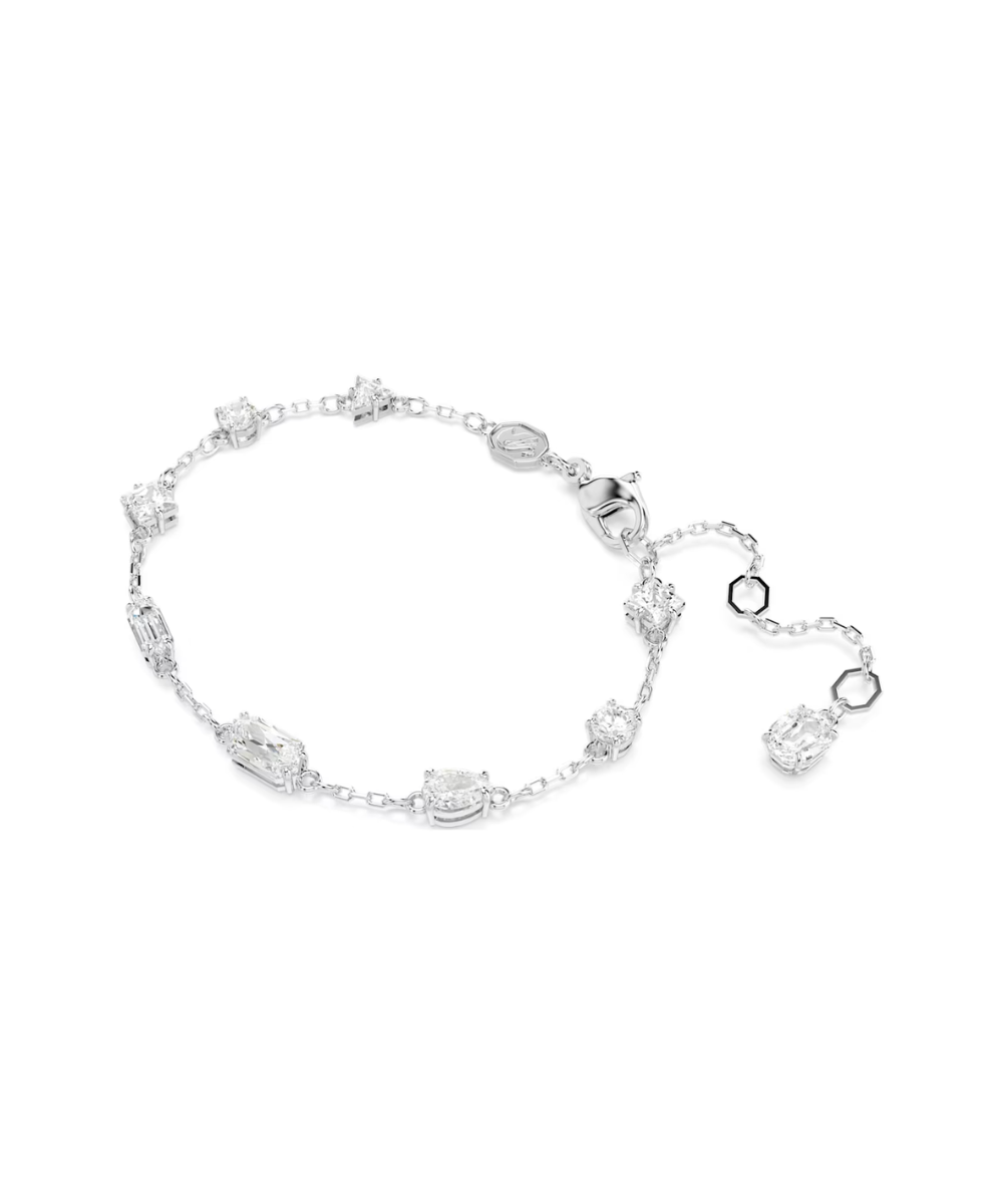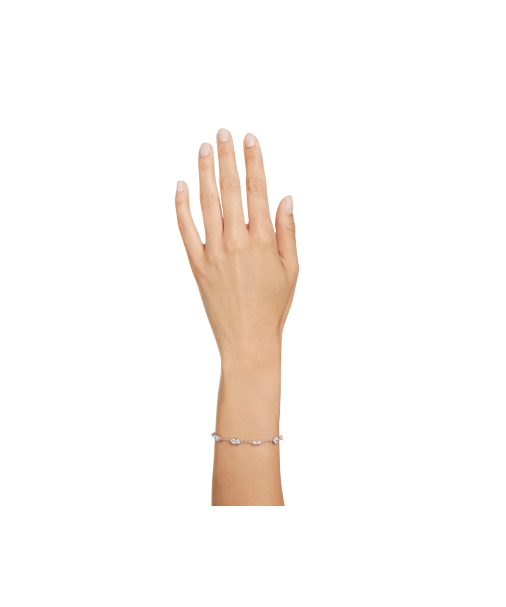 This dazzling bracelet is the perfect example of Mesmera’s surprising and elegant style. The exquisite piece features a delicate rhodium plated chain, scattered with wondrous Swarovski Zirconia in a mix of dramatic cuts. An extra stone is also placed at the end of the hanging elongation. Gift this with a matching necklace for the ultimate look of refinement.