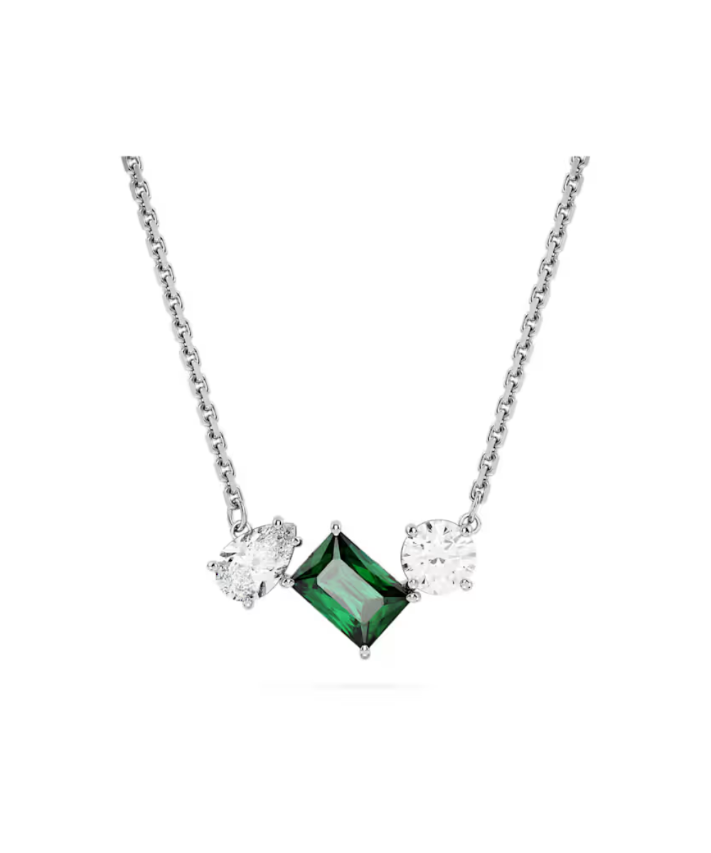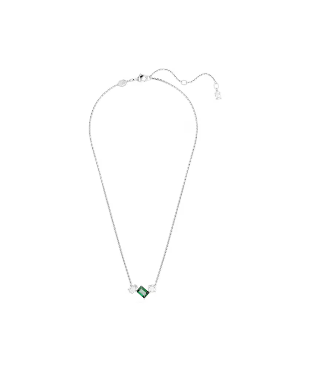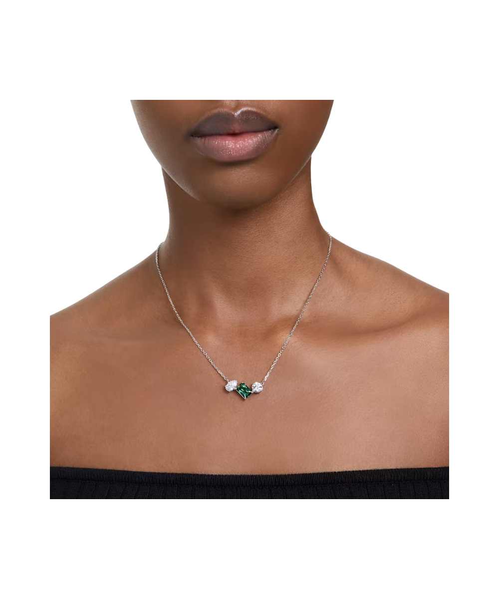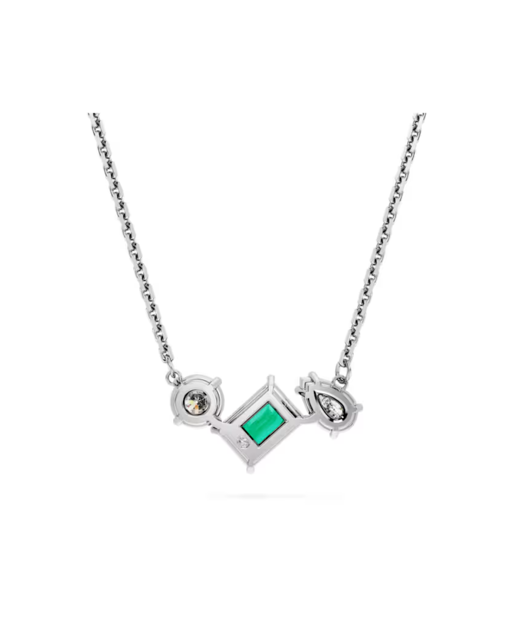 This elegant Mesmera pendant delivers exquisite refinement through its bold mix of cuts and colour. Worn on a delicate chain, the rhodium plated design features a trio of prong-set Swarovski Zirconia in varying shapes with a radiant central stone in hypnotic green. A wondrous gift that will accentuate any style.