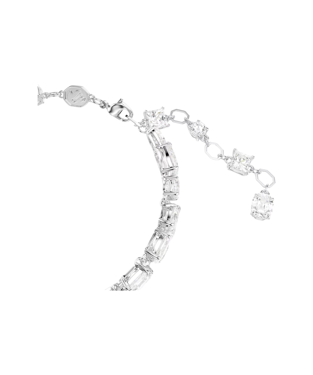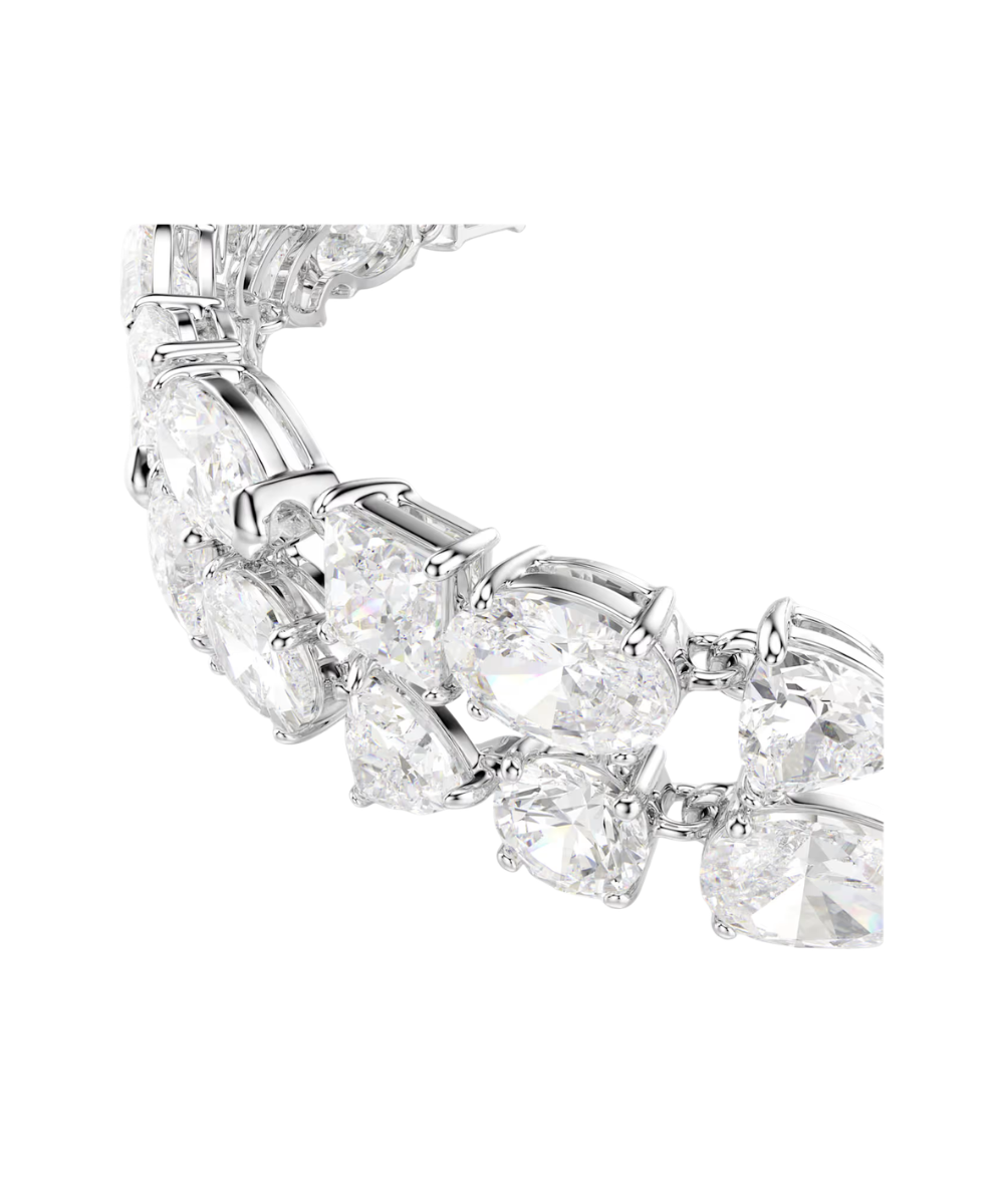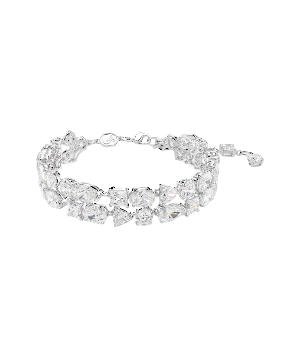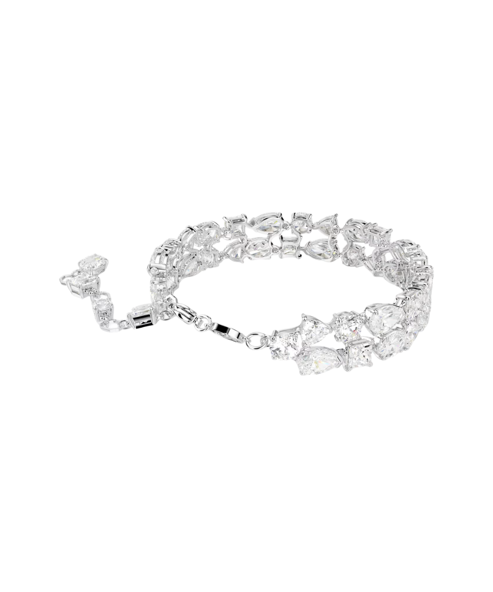 Make this extraordinary double-row bracelet one of the defining pieces of your jewelry collection. The rhodium plated design combines a radiant cluster of prong-set Swarovski Zirconia in a dramatic mix of cuts finished with a lobster closure. For added luxury, the hanging elongation features a string of Swarovski Zirconia. Pure elegance for your own evening style, or a wondrous gift for a loved one.