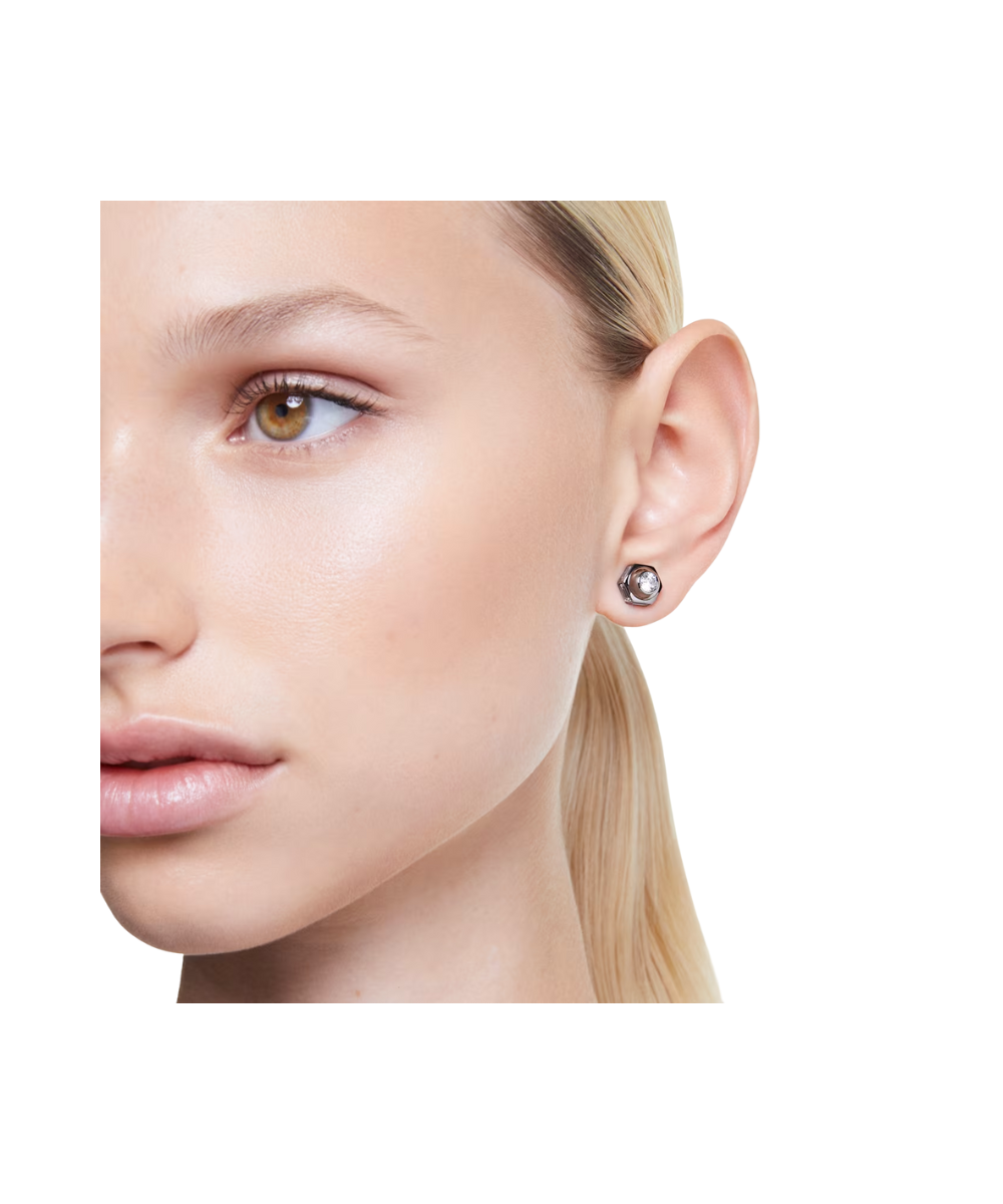 These bold Numina studs are intensely alluring and combine dazzling radiance with metallic engineering. Each piece is black ruthenium plated and features a single Swarovski Zirconia placed within a hexagonal setting. A shiny ball closure completes the look. Choose these edgy pierced studs to add industrial strength to any outfit.